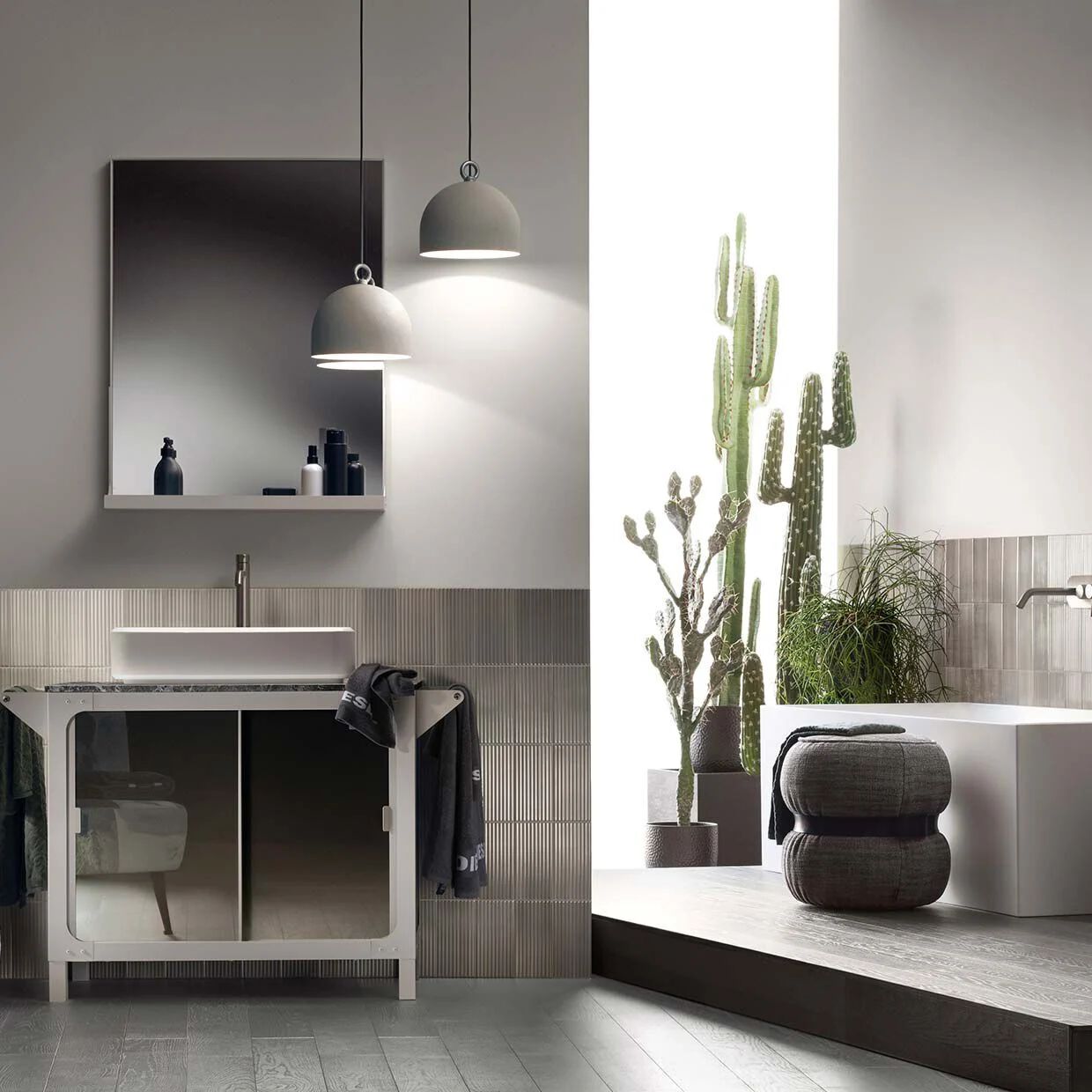 The Misfit Cart unit is in Grey Soft matt painted metal with Mineralmarmo worktop. The composition is completed by the Plug Sink Mineralmarmo sit-on washbasin and the Bronze-finish Lunar mirror. On the right, bathroom cabinet with Titanium finish frame and Bronze glass doors.